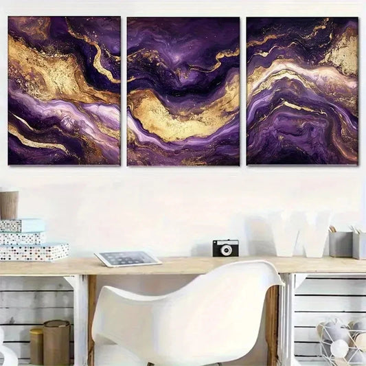 3pcs Elegant Purple Golden & Black Marble Design Metal Print Ready to Hang Art