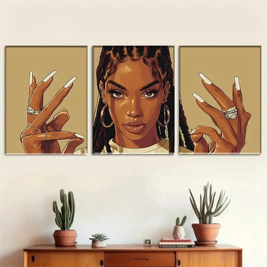 3pcs African American Girl with Long Nails Metal Print Ready to Hang Art