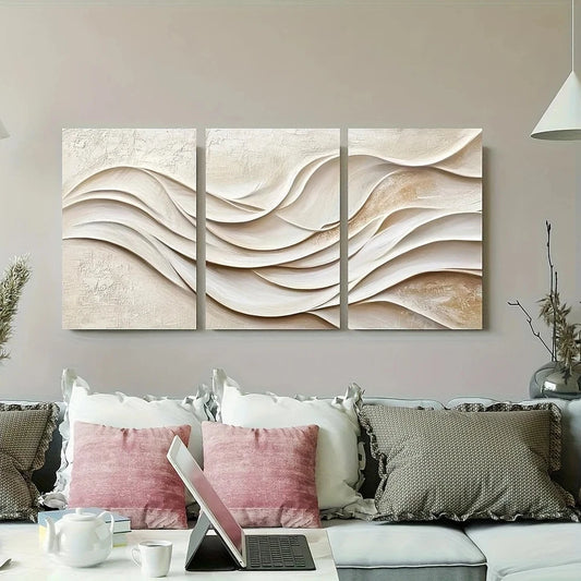 3pcs Abstract Wave White and Beige Design Texture Metal Print Ready to Hang Art
