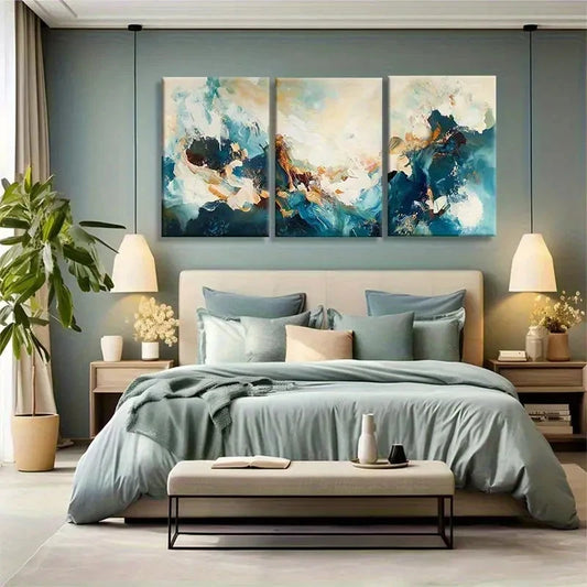 3pcs Abstract Blue and Golden Wave Painting Metal Print Ready to Hang Art