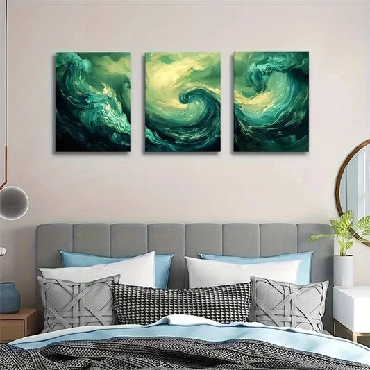 3pcs Abstract Green Swirl Ocean Dynamic Painting Metal Print Ready to Hang Art