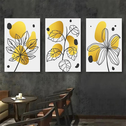 3pcs Abstract Floral Yellow and Black Leaves Metal Print Ready to Hang Art