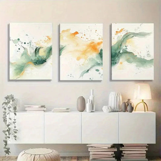 3pcs Watercolor Abstract Green and Orange Flowing Metal Print Ready to Hang Art