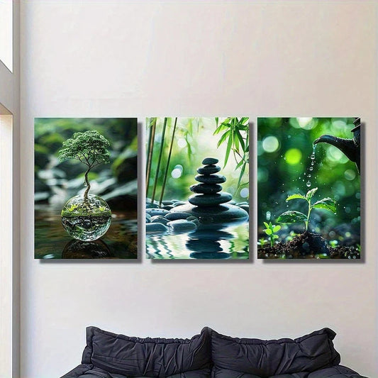 3pcs Bamboo Forest and Stack of Stones Metal Print Ready to Hang Art