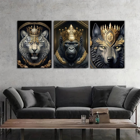 3pcs Lion Crown Design with Golden Accents Metal Print Ready to Hang Art