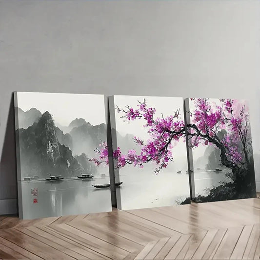 3pcs Purple Plum Blossoms In Full Bloom Wall Art Set Canvas Framed 60x90cm - High Quality Print 100% Australian Made Wall Canvas Ready to Hang