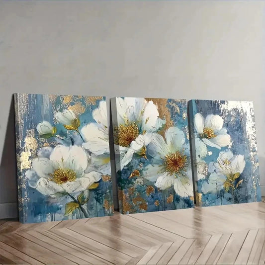 3pcs White Flowers With Blue Accents Wall Art Set Canvas Framed 50x70cm - High Quality Print 100% Australian Made Wall Canvas Ready to Hang