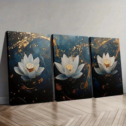 3pcs Elegant Blue & Golden for Lotus Flower Wall Art Set Canvas Framed 60x90cm - High Quality Print 100% Australian Made Wall Canvas Ready to Hang