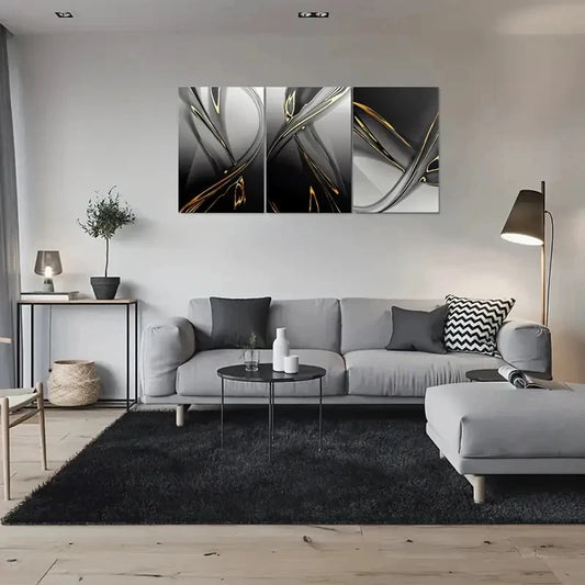 3pcs Black White and Golden Modern Painting Metal Print Ready to Hang Art