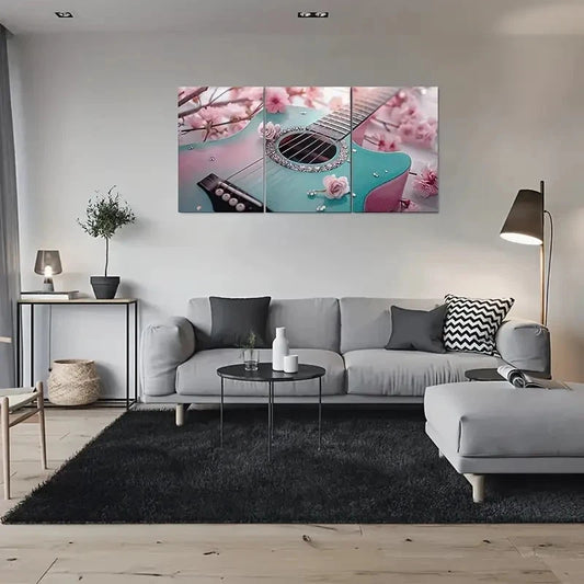 3pcs Acoustic Guitar Pink Blossoms and Rhinestones Metal Print Ready to Hang Art