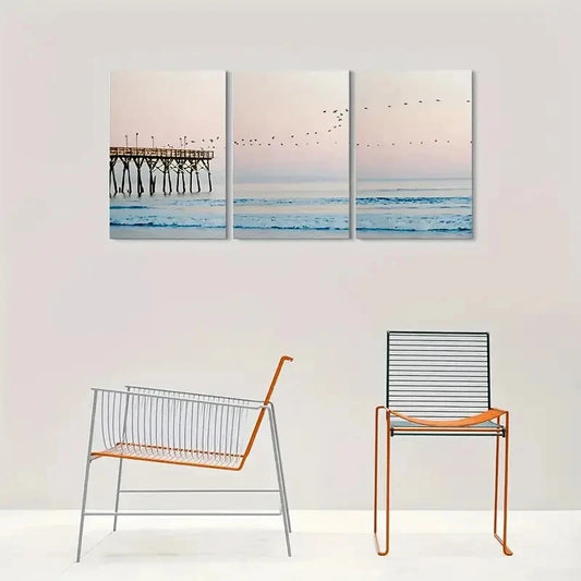 3pcs Coastal Birds Flying Over Beach Scene Metal Print Ready to Hang Art