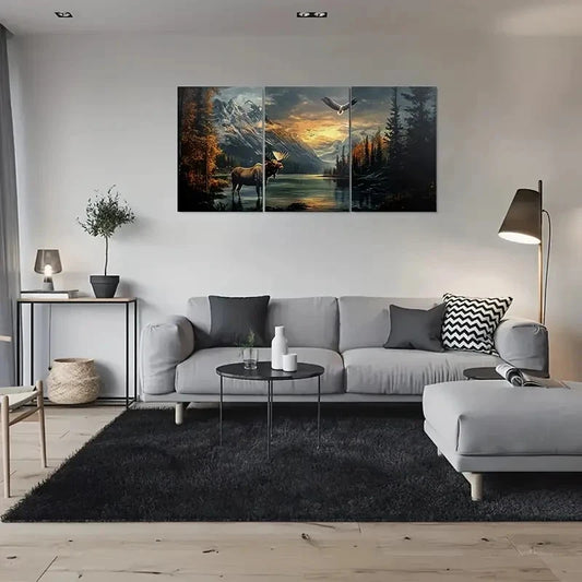 3pcs Mountains Serene Lakeside Moose Eagle Metal Print Ready to Hang Art