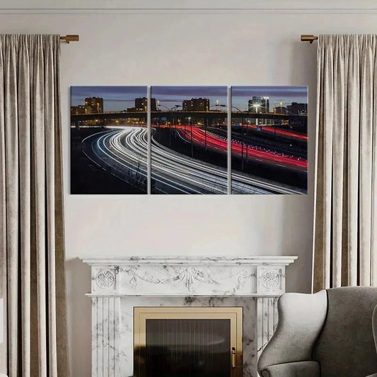 3pcs City Road Night Scene Traffic Flow Wall Art Set Canvas Framed 40x60cm - High Quality Print 100% Australian Made Wall Canvas Ready to Hang