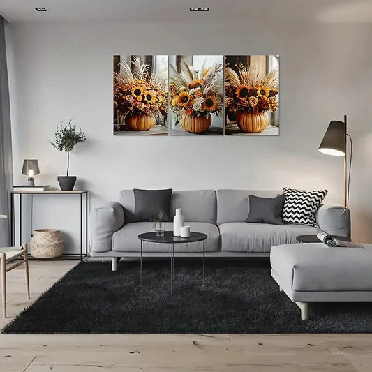 3pcs Autumn Harvest Pumpkin Vase with Sunflowers Metal Print Ready to Hang Art