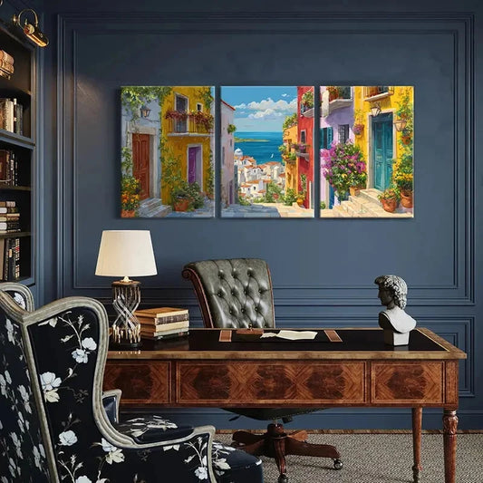 3pcs Vibrant Mediterranean Village Coastal Scenery Metal Print Ready to Hang Art