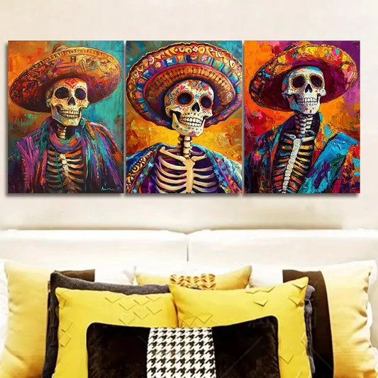 3pcs Mexican Sugar Skulls in Traditional Attire Metal Print Ready to Hang Art