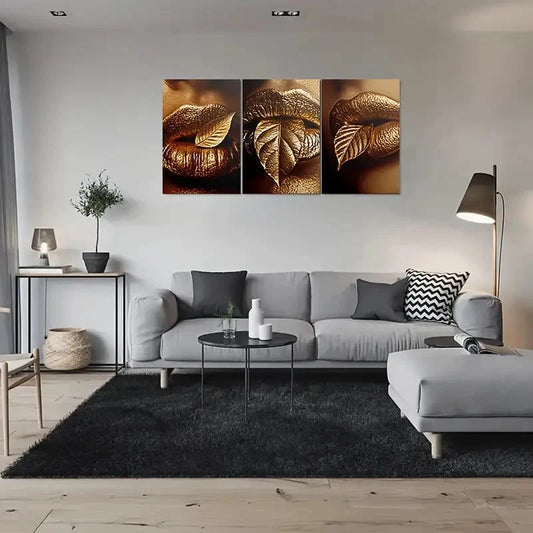 3pcs Golden Leaf Lips Triptych Metal Print Ready to Hang Art