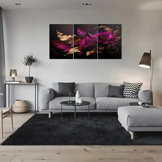 3pcs Purple Floral Feather Painting Metal Print Ready to Hang Art