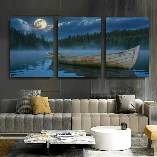 3pcs Full Moon Rowboat Pine Trees Calm Lake Metal Print Ready to Hang Art