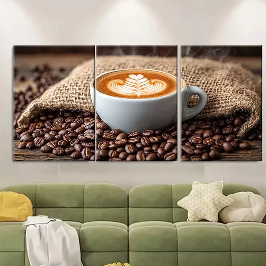 3pcs Latte Art on Coffee Sack Surrounded by Beans Metal Print Ready to Hang Art