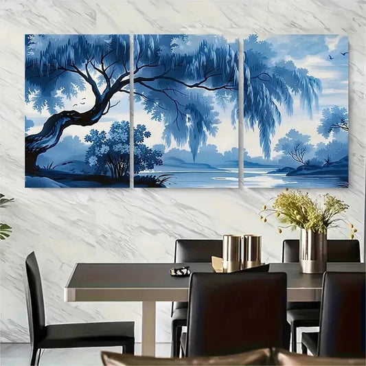3pcs Monochrome Blue River Landscape with Ducks Metal Print Ready to Hang Art