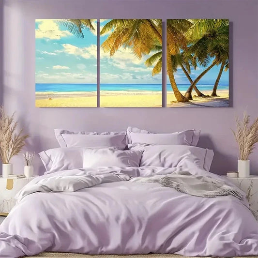 3pcs Coastal Triptych with Palm Trees & Ocean View Metal Print Ready to Hang Art