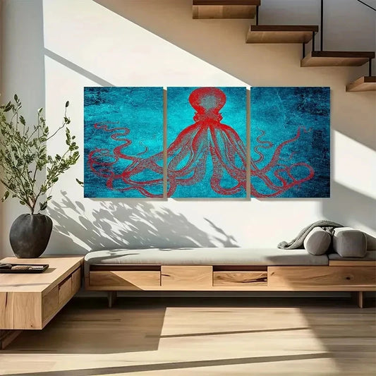 3pcs Blue & Red Kraken Artwork Metal Print Ready to Hang Art