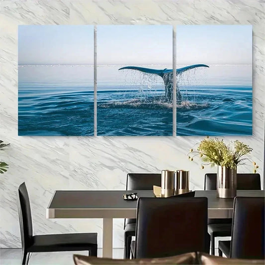 3pcs Ocean Sunset Scene with Whale Fin and Waves Metal Print Ready to Hang Art