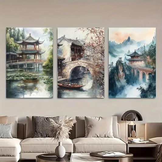 3pcs Chinese Landscape Painting with Tranquil Lake Metal Print Ready to Hang Art