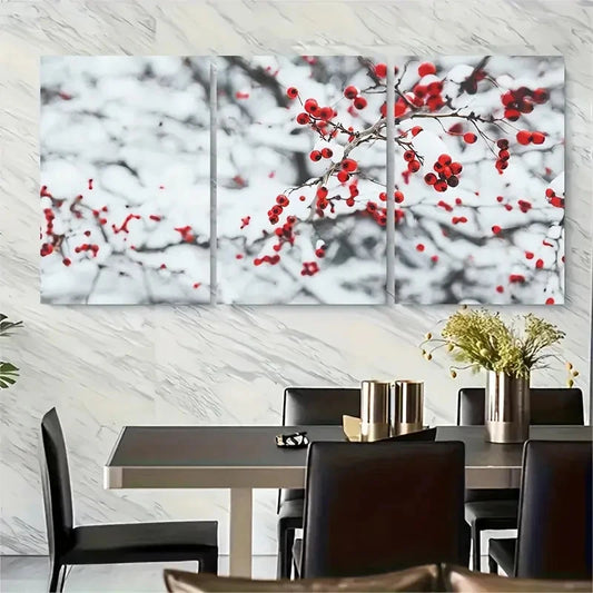 3pcs Snowy Branches with Red Berries Metal Print Ready to Hang Art