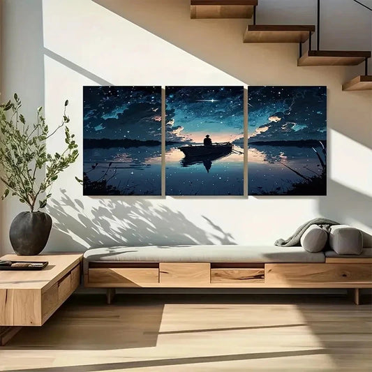 3pcs Night Sky Small Boat Landscape Wall Art Metal Print Ready to Hang Art