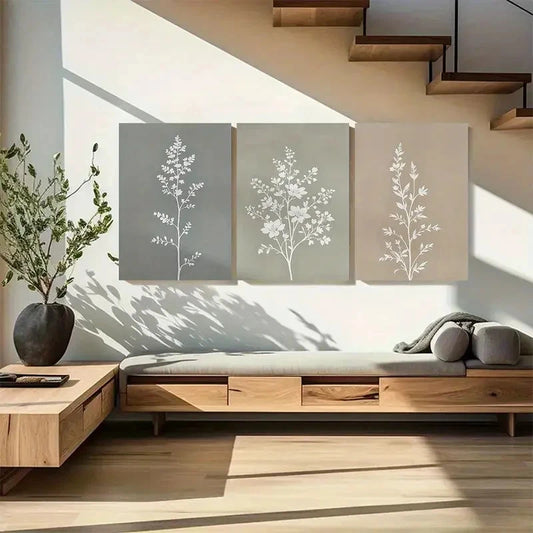 3pcs White Floral Silhouettes on Neutral Wall Art Metal Print Ready to Hang Art