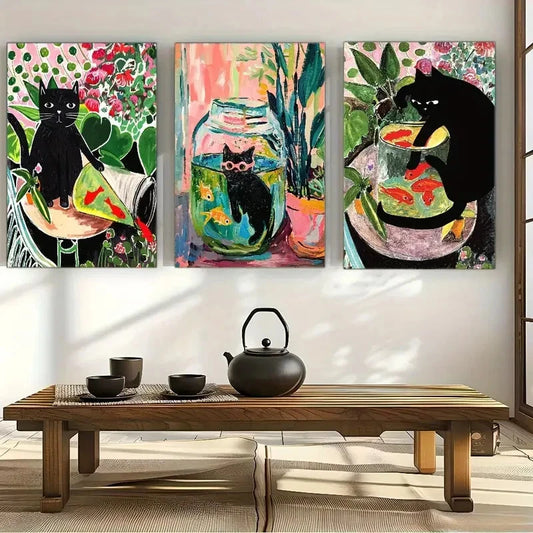 3pcs Cute Black Cat Goldfish and Floral Metal Print Ready to Hang Art