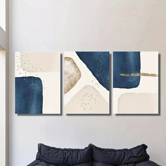 3pcs Blue and Beige Shapes with Golden Accents Metal Print Ready to Hang Art