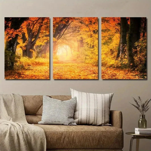 3pcs Autumn Forest Sunset Vibrant Yellow Leaves Metal Print Ready to Hang Art