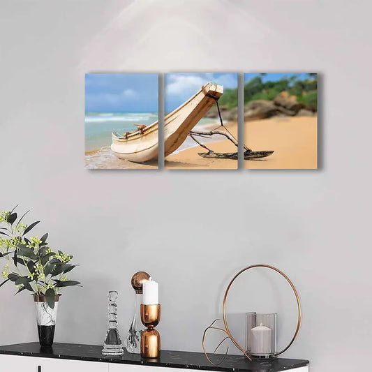 3pcs Modern Fishing Boats On Empty Beach Metal Print Ready to Hang Art