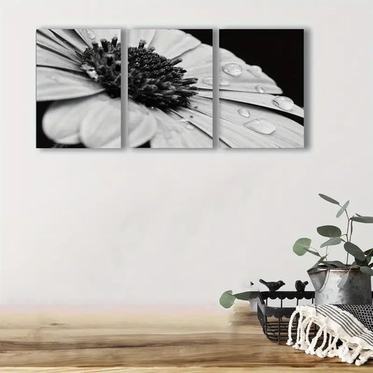 3pcs Black White Daisy With Dew Droplets Canvas Metal Print Ready to Hang Art