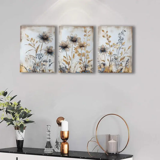 3pcs Vintage Blue & Golden Floral Canvas Metal Print Ready to Hang Art