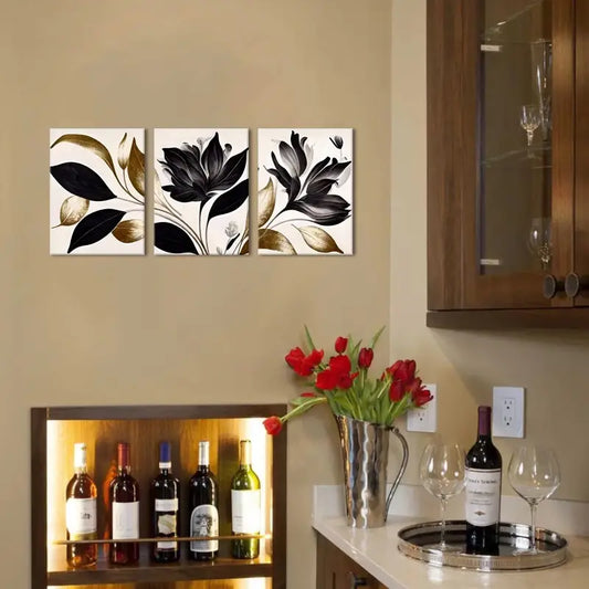 3pcs Vintage Floral Design With Black & Golden LeavMetal Print Ready to Hang Art