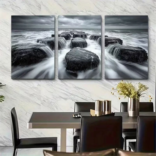 3pcs Dramatic Black and White Coastal Seascape Metal Print Ready to Hang Art