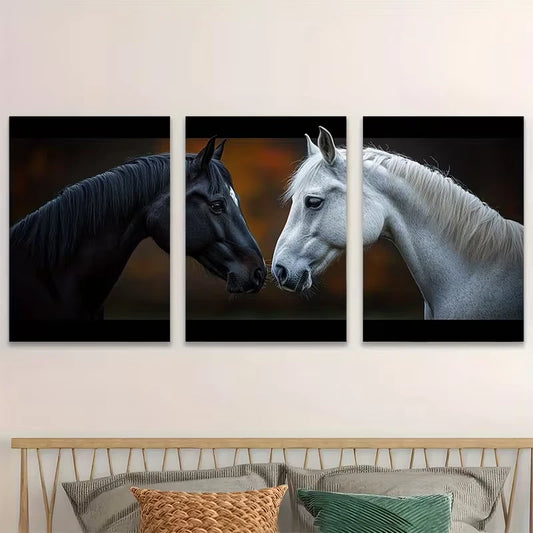 3pcs Couple Horses Black White Metal Print Ready to Hang Art