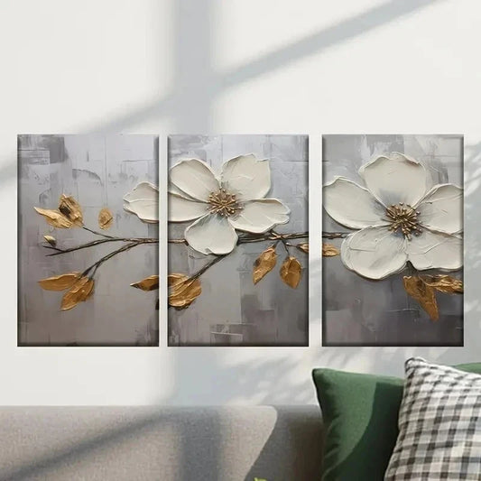 3pcs White Flower with Golden Leaves Wall Art Set Canvas Framed 40x60cm - High Quality Print 100% Australian Made Wall Canvas Ready to Hang