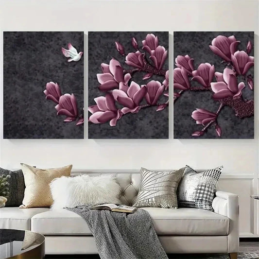3pcs Elegant Pink & Golden Magnolia Floral Metal Print Ready to Hang Art