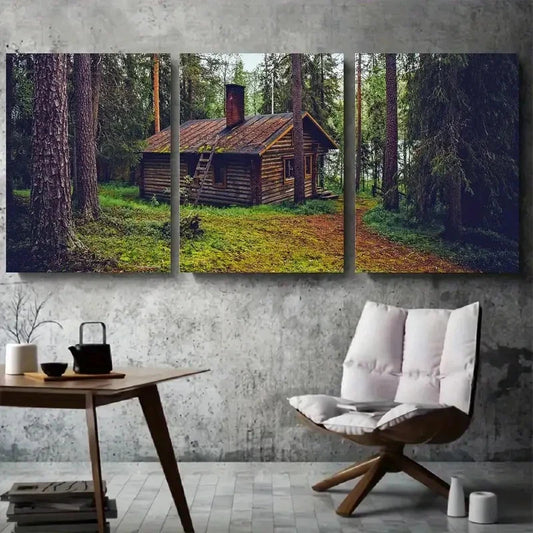 3pcs House Surrounded by Tall Pine Trees Metal Print Ready to Hang Art