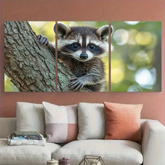 3pcs Adorable Baby Raccoon Climbing Wildlife Metal Print Ready to Hang Art