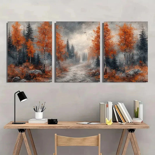 3pcs Autumn Forest Winding Trail Nature Painting Metal Print Ready to Hang Art