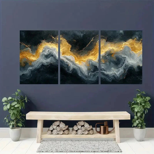 3pcs Minimalist Abstract Golden & Black Wave Metal Print Ready to Hang Art