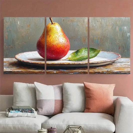 3pcs Pear on a Plate with a Leaf Metal Print Ready to Hang Art