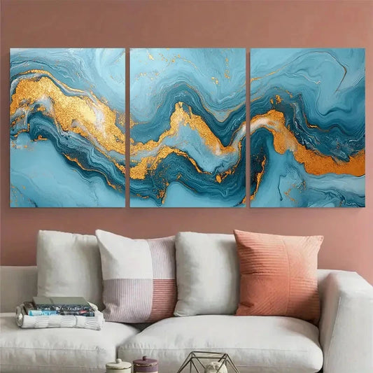 3pcs Elegant Light Blue Marbled with Golden Accent Metal Print Ready to Hang Art