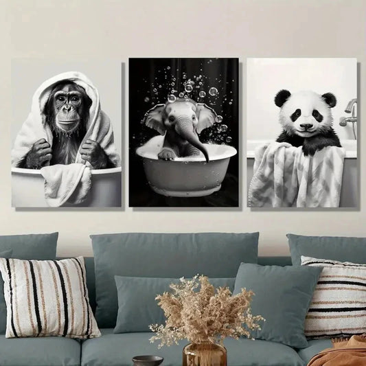 3pcs ,Adorable Cartoon Animals Enjoying a Bath Metal Print Ready to Hang Art